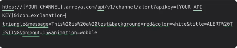 This request would trigger a red background alert with white text, a wobbling triangle icon, and the title “ALERT TESTING” that lasts for 15 seconds.
